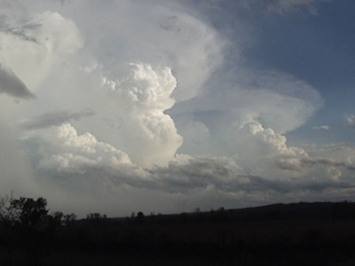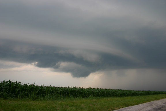 These two pictures were taken about 60 miles apart in distance and nearly two hours in time; the first near Barry, IL and the second just west of Springfield. The second embedded supercell formed about 30 miles down the line from where the first one was ending at the time. Notice the similarity in the storm structure in the two pictures, despite the fact that they were different cells at different times at different locations along the squall line.