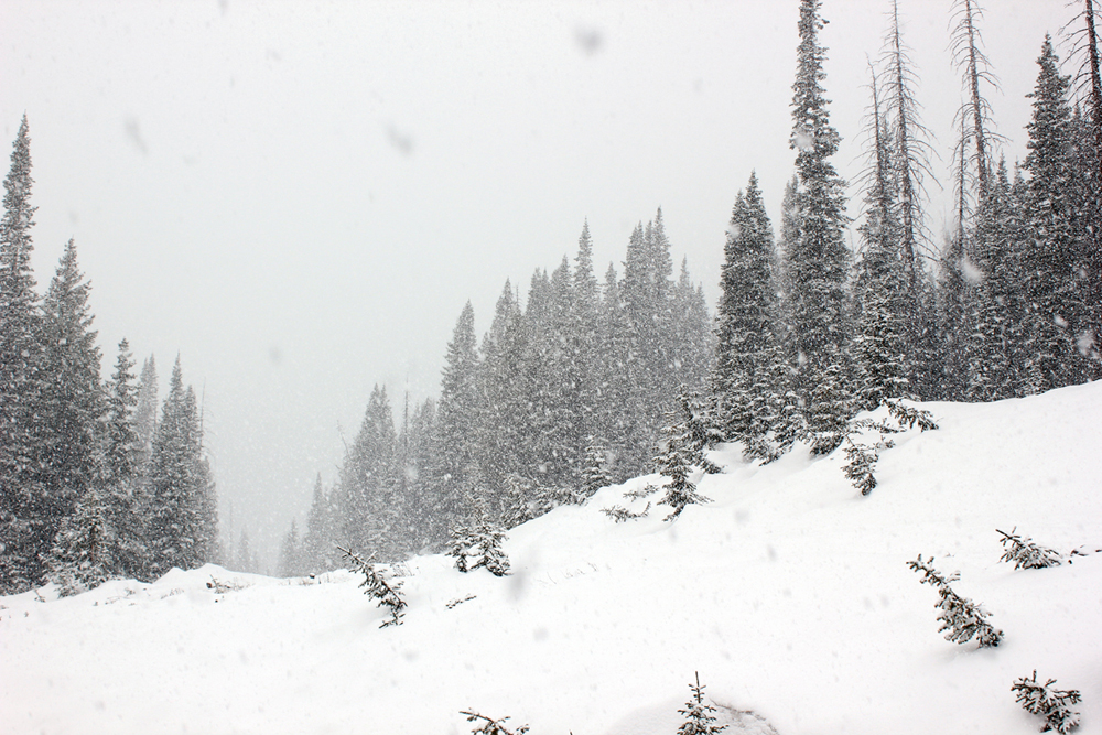 Still looked very skiable, in fact, despite now being a month past the end of Wolf Creek's ski season. I moved down to the far end of the lower parking lot, to get a better view to the southeast and to get farther from road noise. Gradually with time, the snow increased, and became quite heavy for a while: