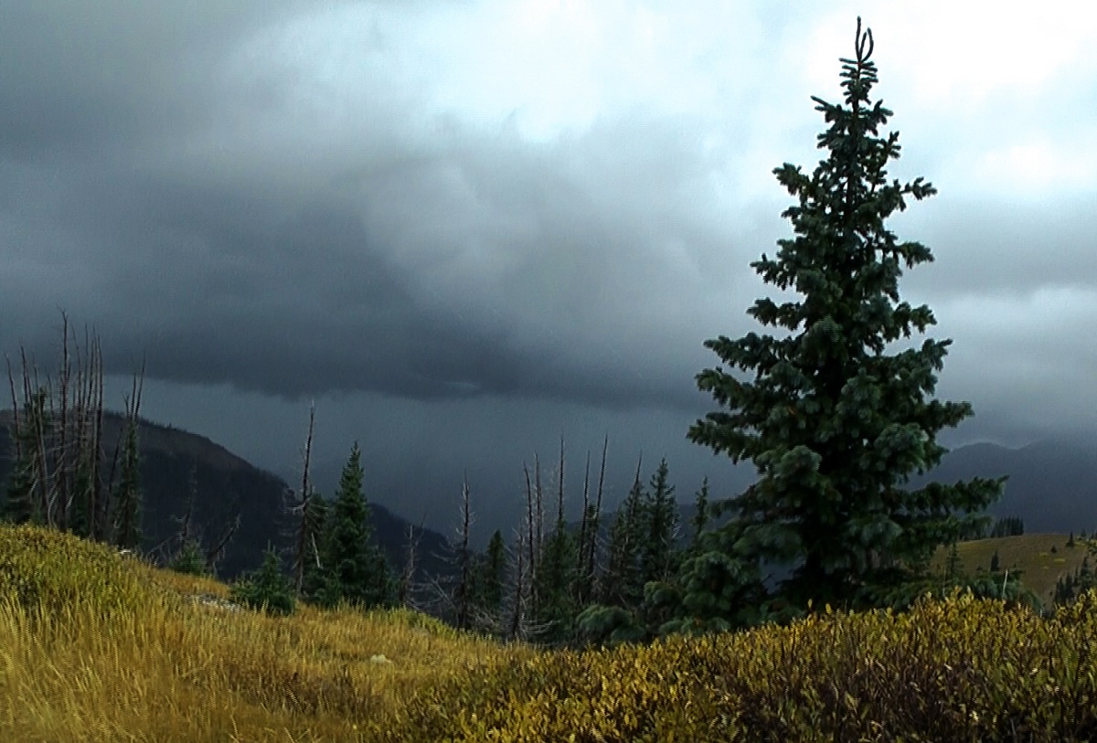 This area would like pass right over my location, or at least very close to it. Soon, precipitation began to also fall from the updraft base ahead of the gust front feature, and I knew the heavier precipitation was very close. Still no thunder up to this point, though. I decided to slightly reposition my car in the parking lot so that the wind and snow would be blowing away from the driver-side window that I was looking out of and getting video from. Soon the graupel (snow pellets) that had been falling intermittently since I arrived at the overlook became steadier and heavier, and the wind increased. Then, gradually, the graupel transitioned to mostly ordinary snow. There was some back and forth in the mix of ordinary snow and graupel from then on, but most of it was ordinary snow. Perhaps 4 or 5 minutes after the heavier precipitation began, I started to hear distant rumbles of thunder. So low, at first, that the video camera did not even pick up the sound of it. But after a few more minutes it became louder and much more frequent. I ended up getting about 5 minutes of frequent thunder with the snow and an occasional mix of graupel with it. Lightning was close enough to be visible 3 or 4 times, and there were two very close and very visible flashes, followed by a crack of thunder within a second. So these two flashes were within a quarter mile of me. This made me a little nervous to have the window rolled down, and I did back away from it a bit, but was fine. And then the thunder and lightning ended almost as quickly as they started, with only one more rumble of thunder after the second close lightning and thunder. But the snow kept coming down, and the wind increased. But no more thunder, so arould 2:30 I started the trip back down. I think that the period of thundersnow was mainly between about 2:10 and 2:20. By the time I left, there was some accumulation of the snow, perhaps up to a third of an inch in some of the grassy areas although very little on the road due to the warm ground. As I headed down, I was surprised that before I even got down to Wolf Creek Pass, rain began to mix in, and by the time I was back down to the pass, it was more rain than snow. Although I suspect there was more snow at the pass level at the height of the storm, I was glad that I had gone up to the Lobo Overlook where there was no rain mixed in at all. Continuing down from the pass, I did encounter a couple heavier bursts of precipitation with a little more snow mixed in, so I would imagine the snow at the overlook continued for a while after I left. And by the time I got back to Pagosa, a third band of thundershowers was moving through, and this band produced more snow in the mountains. By the next morning, the mountains visible from town had a nice coating of snow at the upper altitudes, and there was enough snow a little farther north in the Weminuche Wilderness that the mountains still remained snow covered 3 days after the storm passed.