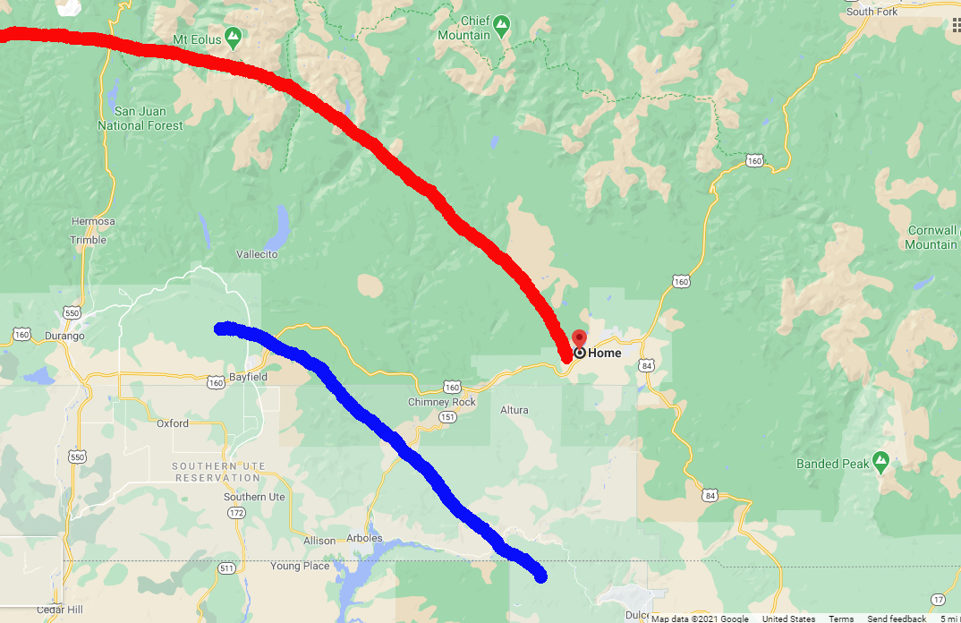 I got a little excited because I had heard talk of possible funnel clouds farther north near Grand Junction, but zooming in as close as possible with my video camera revealed that what I thought was more likely was true: This was just a narrow precipitation shaft that developed under the cloud base. Since it was evident that the storms were still pretty far away, I went home to copy my video to the computer and take a look at it. But after a half hour or so I could see that the new showers and storms that had developed over northern New Mexico were getting closer, and that there had been some CG lightning strikes just on the CO side of the state line. So I headed out again, returning for a third time to Veterans Memoral Park. Here I could see that the precipitation was within a few miles to the southwest of my location, so before long I decided to head into it. At first, I expected to intercept the core of this storm somewhere near or at least not much past Aspen Springs. But it became evident that I would have to go farther. The reason for this is that this storm was moving to the northwest, not close to the due north as the original one had started out doing. The reason for the increasingly westerly movement of both storms is that the low pressure passing to my south in northern NM was moving farther east, so that I was more and more in the westerly flow circulating around the low pressure on its north side. The heaviest precipitation in this storm, it turns out, was passing somewhere closer to Chimney Rock National Monument. I went there, and a little south of there, observing heavy snow at times (all ordinary snow, not graupel now), but no thunder. A later check of the lightning tracker showed that around a dozne lightning strikes had occurred in far southern Colorado with this storm, southeast of Chimney Rock and northwest of Dulce, NM. But by the time the storm reached the Chimney Rock area, there was no more lightning. I probably could have gotten into thundersnow in this storm if, instead of going home earlier, I had taken the unpaved back roads into the area between Pagosa Springs and Navajo Lake, but that was a little more adventure than I wanted to undertake. So after a while of watching heavy snow come down near Chimney Rock, I headed home.