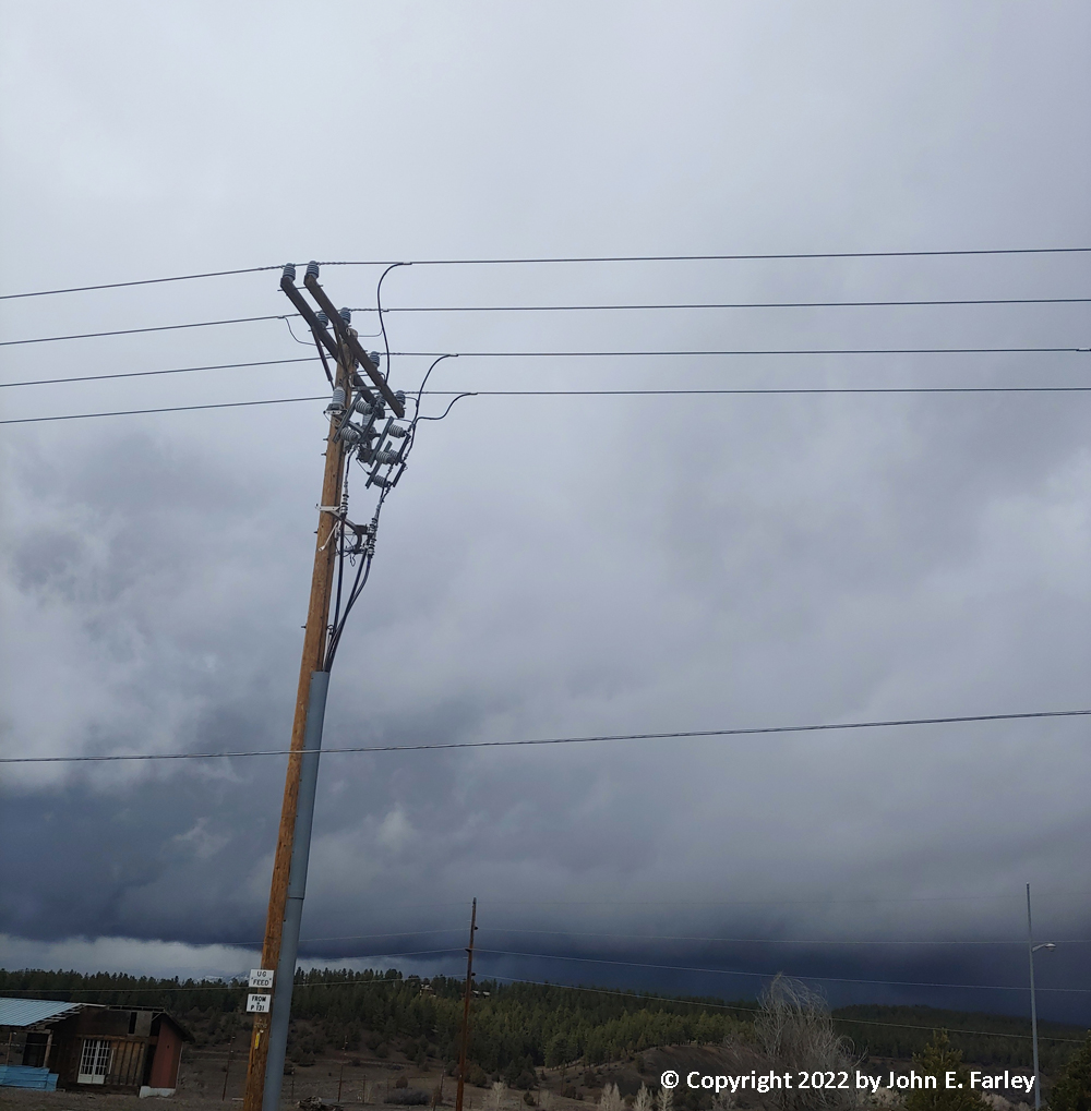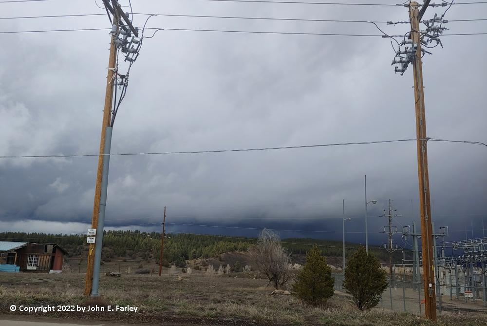 A few miles southeast of town, I think just past the Wildlife Park, I could see a very heavy shower was moving in, so I turned off on a side road and stopped to get some video. A heavy shower of graupel (snow pellets) mixed with ordinary snow quickly moved in, but there was no thunder and lightning. Once this seemed to have mostly passed over, I decided to move farther southeast, since most of the lightning strikes had been closer to the NM state line.