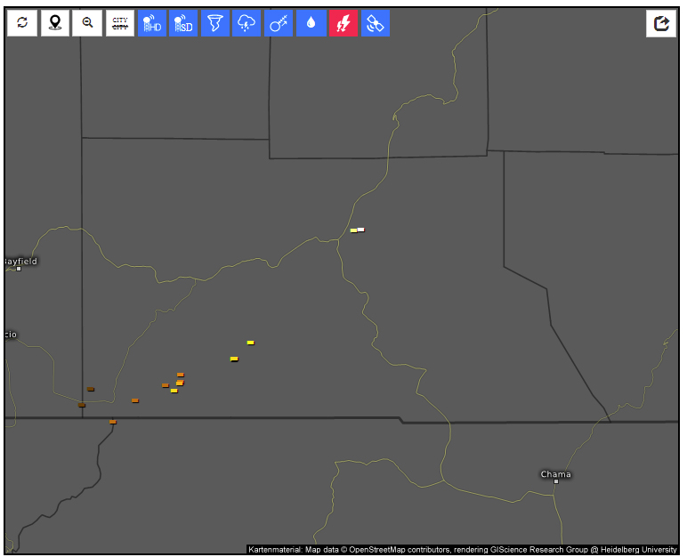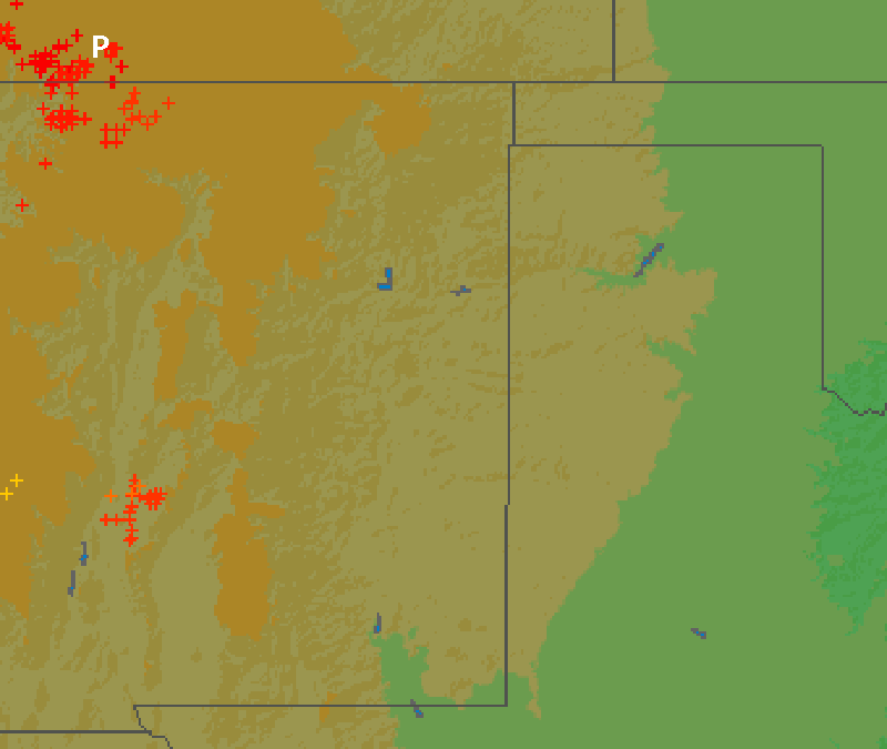 While this map may truncate a little of the northwest end of the swath, the swath of lightning strikes from around Durango extending ESE to around Chama can be seen clearly. I put the letter P on the map to show the approximate location of Pagosa Springs. This map seems to include all of the strikes that were on the real-lightning tracker I was using, from the same website. Note that there is a cluster of five or so strikes just east of Pagosa Springs and that this map also picks up on the handful of strikes that occurred northwest of there and north of Chimney Rock. As you can see, this line of storms generated quite a large number of lightning strikes for a storm in which much of the precipitation was falling as snow.