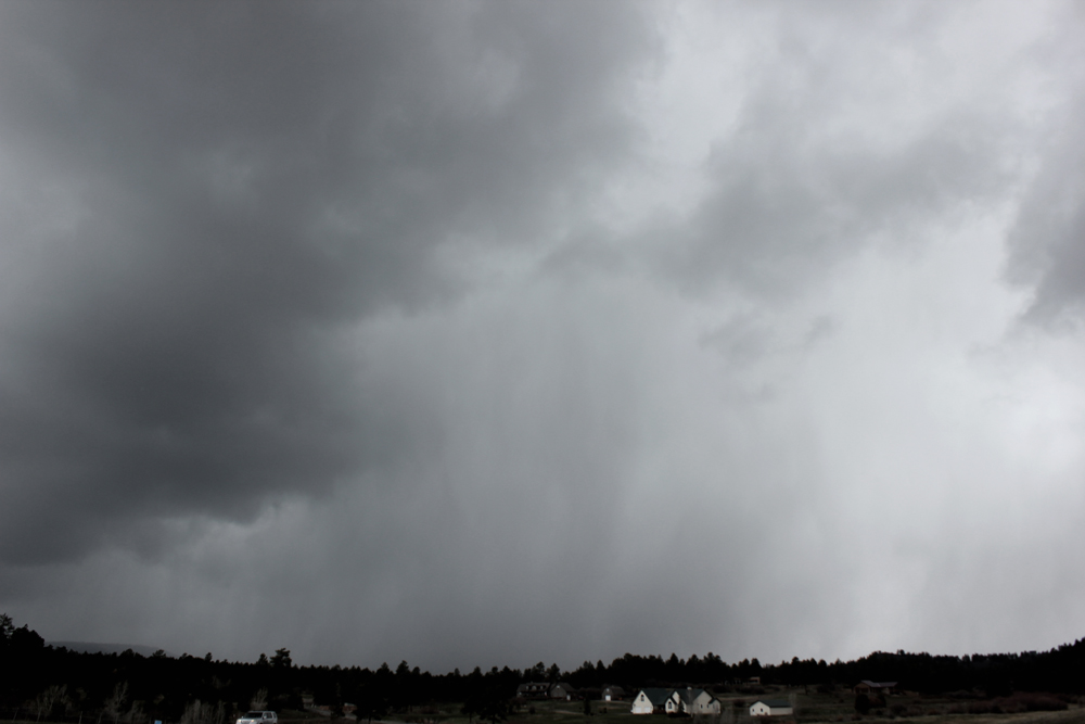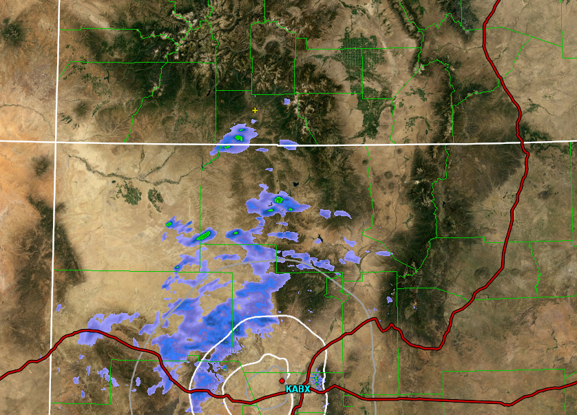 My location was near the north edge of the precipitation returns on the radar southwest of Pagosa Springs (the cross on the radar image is the approximate location of our house). Keep in mind that this area is quite distant from any radar site, and that often snow in Archuleta County does not show up at all on radar. But these convective storms had tops high enough that some, though not all, of the precipitation did.