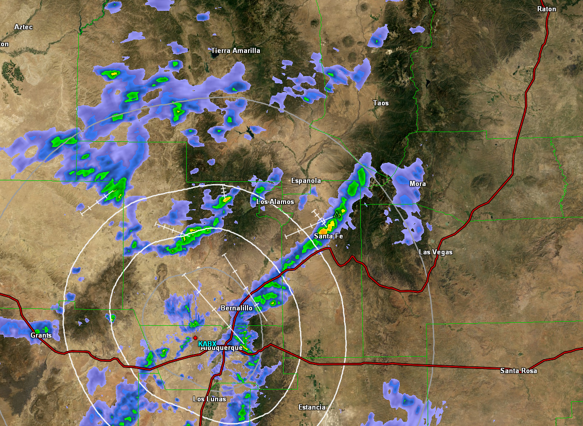 By this time, the storms were in a pretty solid line from the west slopes of the Sangre de Cristo Mountains a few miles from my location all the way southwestward to the Sandia Mountains and parts of the Albuquerque area. The line formed quickly from one or two storms including the one pictured earlier that formed at the south edge of Santa Fe. At first the line moved toward the northwest, which put it just out of my reach to get into the heavy part, then it pretty much stalled out and remained in the same place, gradually becoming larger but weaker. Here are a couple of radar images showing the line of storms at 206 p.m. (first image) and 2:24 p.m. (second image):