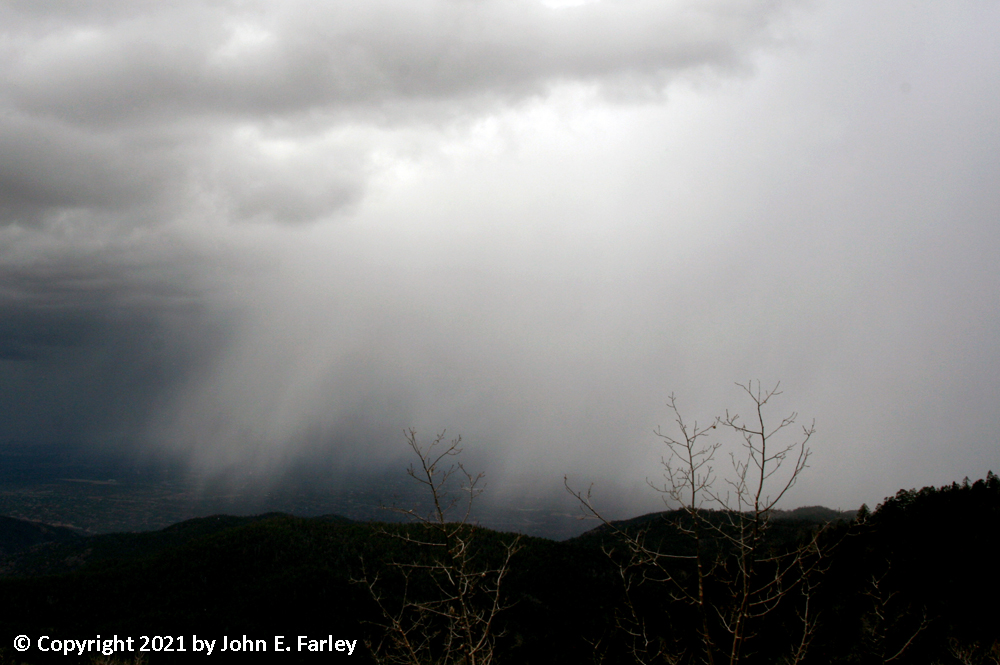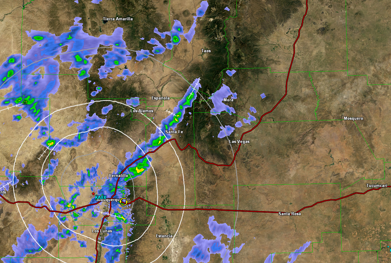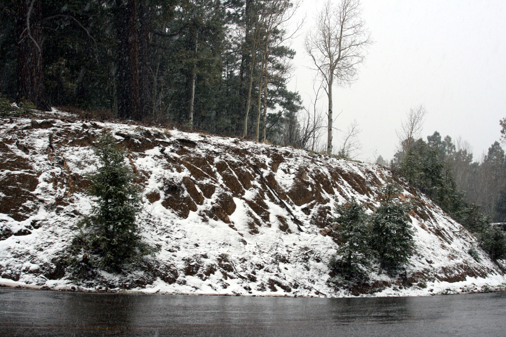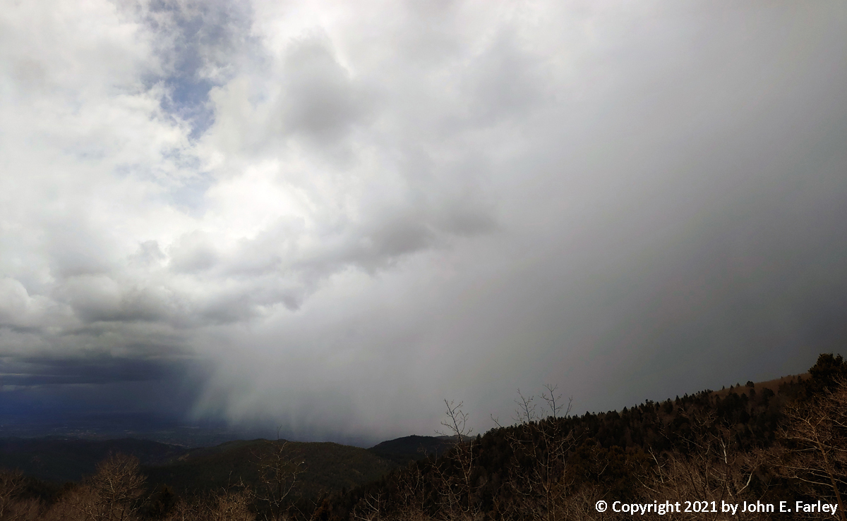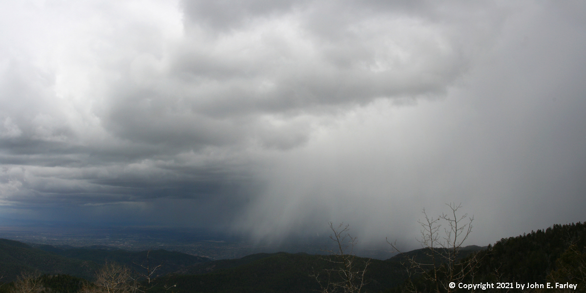 By around 4:00 p.m., about two hours after I had observed the thundersnow at the scenic overlook, it became evident that this second save of snow was winding down, so I decided to return to Santa Fe. The snow, lighter now, became mixed with rain near the upper end of the state park, and was all rain by the time I was farther down into the state park. More snow did move into the area around Ski Santa Fe again toward sunset and into the early part of the night, but I never saw any more evidence of lightning on the lightning tracker. By around 10 p.m., the action was clearly shifting to the south of I-40. Before that happened, areas on the southeast fringes of the Albuquerque area got well over an inch of rain, as a batch of storms formed on the southeast slopes of the Sandia Moutains just behind the initial line and continued to drift northwestward over the same areas for an extended amount of time. Later, up to 7 inches of snow fell in the Sacramento Mountains, as the storm provided much-needed moisture in several parts of New Mexico.