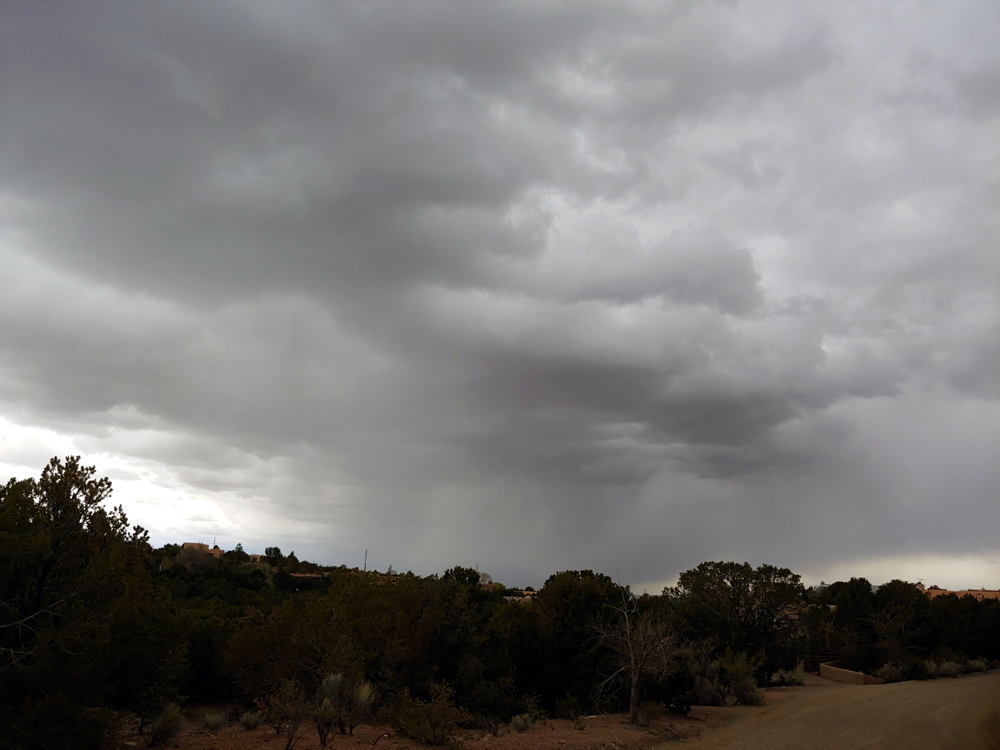 By around mid-day, it was looking like it was about to happen. There was not much in the way of lightning near Santa Fe on the lightning tracker, but an intense shower had developed just south of Santa Fe and it looked like it was only a matter of time. With the low pressure center not too far south and moving slowly, the movement of showers and thunderstorms during the morning had been erratic at best, but it looked now like the dominant movement was a slow drift toward the west or northwest, which with time would probably change to moving toward the southwest as the low pressure got farther east. I could see updraft base extending northeastward from the shower extending just to the southeast of my location in Santa Fe, so I figured up the line in the mountains there could be thundersnow if the NE-SW band of updraft and showers expanded into a line. Which, as it turns out, it did. Around 12:30 I started up the road toward Ski Santa Fe, stopping around 12:45 to get this picture of the developing storm near the southern edge of Santa Fe: