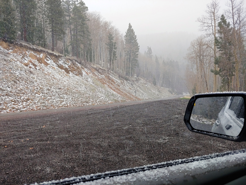 Gradually it became evident that the heaviest part of the snow moving in from the east seemed to be coming in to the southwest of the ski area, between the ski area and the state park. So, I gradually moved down toward the state park, making several stops. The snow did increase in intensity, at times becoming mostly graupel/snow pellets, and the clouds looked convective. In a few areas the snow had accumulated to around a half inch on grassy surfaces with some in the trees, but despite a snowplow that made a pass one place where I was stopped, it did not seem to be accumulating much yet on the road. And no more thunder. Here are a few pictures from this phase: