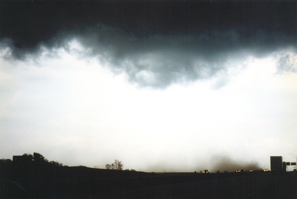 Like the one above near Lincoln, this tornado just southeast of the "Big I" freeway interchange on the southeast side of the Quad Cities had no condensation funnel. But the clouds were rotating strongly above the dust swirl (you can see this by looking at the relative positions of the lowered clouds in the front and back above the dust swirl), so what was going on at ground level was clearly tied to rotation in the clouds above. This seems to have formed as the leading edge of a bow echo interacted with an outflow boundary from another storm to its northeast.