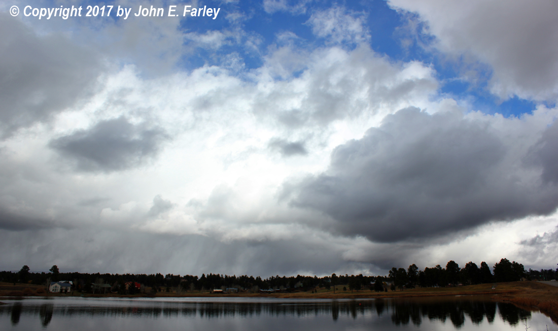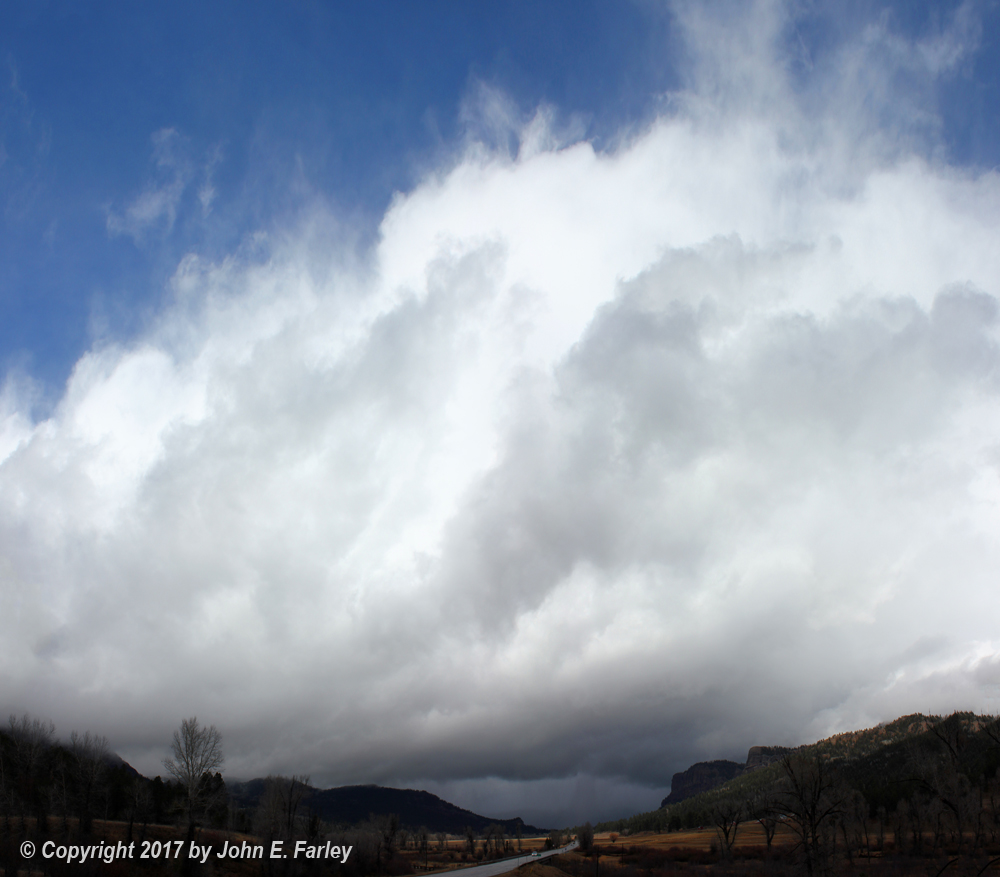 Around 1:30 I left home to go pick up routine medication for our cat at the San Juan Veterinarian Clinic which is a mile or two northeast of Pagosa Springs along U.S. 160. I figured that while I was out, I would also head up toward Treasure Falls to see if I could get any decent pictures of the snow that had been falling higher up in the mountains. However, this ended up being more of a winter storm chase, as that opportunity presented itself and with the low visibility, any snow photography would have required driving well up into the mountains. In town, there had been rain off and on overnight and into the morning. However, by now, the precipitation had become more scattered and convective, and in town, the sun had been out for a while. As I got to Piņon Lake, not far from home, I noticed a line of fairly decent convection to the north, with shafts of what looked like frozen precipitation coming out of the cloud base: