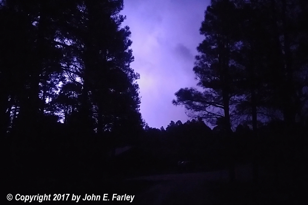 For a while after that the weather stayed calm, but with lots of showers on radar to the west and northwest, I figured that would change. Intermittent light rainshowers returned during the early evening, with occasional distant rumbles of thunder. The lightning tracker showed one cluster of strikes near Arboles,CO and Navajo Lake early in the evening, then another around Chama, NM later. There were also a handful of strikes in the San Juan Mountains east of Chama and Pagosa Springs, likely indicating some mountain thundersnow. Starting around 9 p.m., there were occasional heavier showers of mixed rain, graupel, and snow at our house. Around 9:40, there was a loud rumble of thunder, indicating lightning pretty close. I decided to try getting some video looking out of the garage onto the driveway. P-type when I started was mainly graupel (snow pellets) with perhaps a little rain mixed in, but after a few minutes the graupel increased and mixed with a little hail. Then a flash of lightning, followed in a few seconds by thunder, indicating the lightning was less than a mile away. The precipitation decreased shortly after that, mixed with ordinary snow, and then abruptly stopped - with another flash of lightning just then. Only about 3 seconds between the flash and the thunder, so the lightning was barely more than a half mile away. There were two more flashes after that, and another burst of graupel/snow pellets. By around 10 p.m., the mixed winter precipitation and lightning were over. Here is a video capture of one of the flashes of lightning: