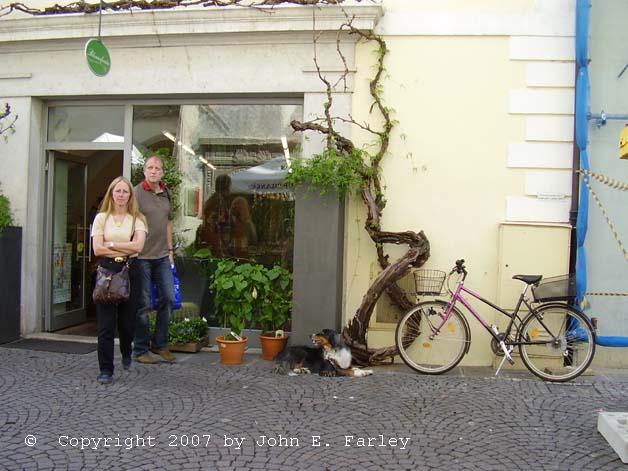 While eating supper at a sidewalk cafe, I looked across the street to see this scene in Bolzano, Italy in July, 2007.