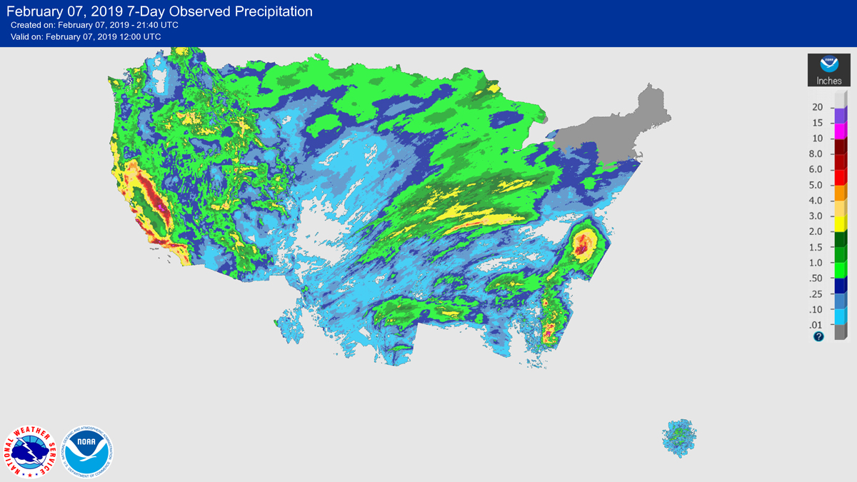 There are areas on both coasts that received more than 5 inches of precipitation over the seven days. Many areas in between received 2 to 5 inches. Snow-water equivalent amounts of over 1 inch are common in areas where the P-type was snow, and in some places in the Sierras, snow moisture exceeded ten inches.