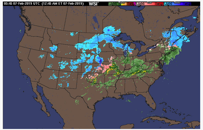This radar image, from later that evening, illustrates the AR character of the event - note that precipiation is scattered all the way from Nevada, Utah and Idaho to the East Coast:
