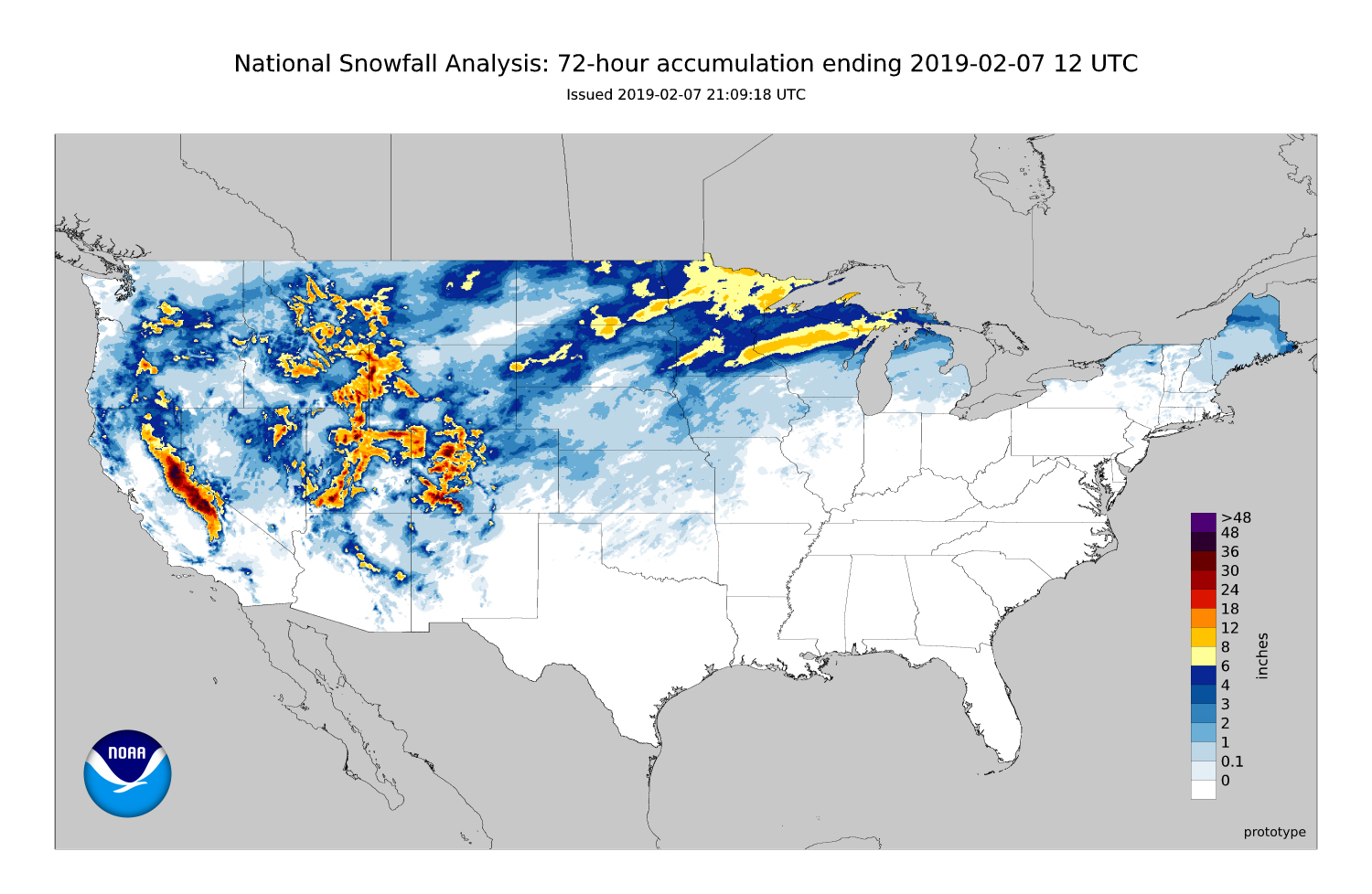 The trailing system was slightly colder and tracked slightly farther south. It was, for example, cold enough to produce a rather unusual snow event in Seattle, where schools were closed on February 4, 5, and part of the 6th. In Salt Lake City, the snow was heavy enough to close schools for the first time in 20 years. Snow and graupel (snow pellets) fell in Las Vegas, and there were even a few snowflakes in San Francisco. But the big impact of the storm was in the mountains, particularly the Sierra Nevada, where even ski areas were forced to close because of the severe conditions. Between the two main waves of energy and some snow that fell in between, California's Mammoth Mountain got 7 1/2 to 11 FEET of snow. Squaw Valley was not far behind with 5 to 7 feet, and all roads in Yosemite National Park were closed for a time due to concerns about falling trees. As shown on the map below, very heavy snow of a foot and a half or more also fell in numerous locations up and down the chain of the Rocky Mountains: