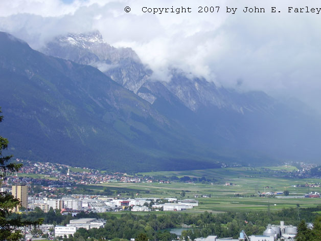 I shot this view of the Alps and the Inn River valley from Schloss Ambras in Innsbruck, Austria in July, 2007.