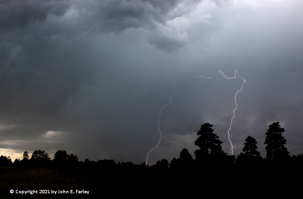 Using the Lightning Trigger, I caught a couple simultaneous bolts, or perhaps some branching from a bolt partly hidden by the cloud, from a storm that was just to the southwest of Pagosa Springs. Also a little branching going on in the right bolt.