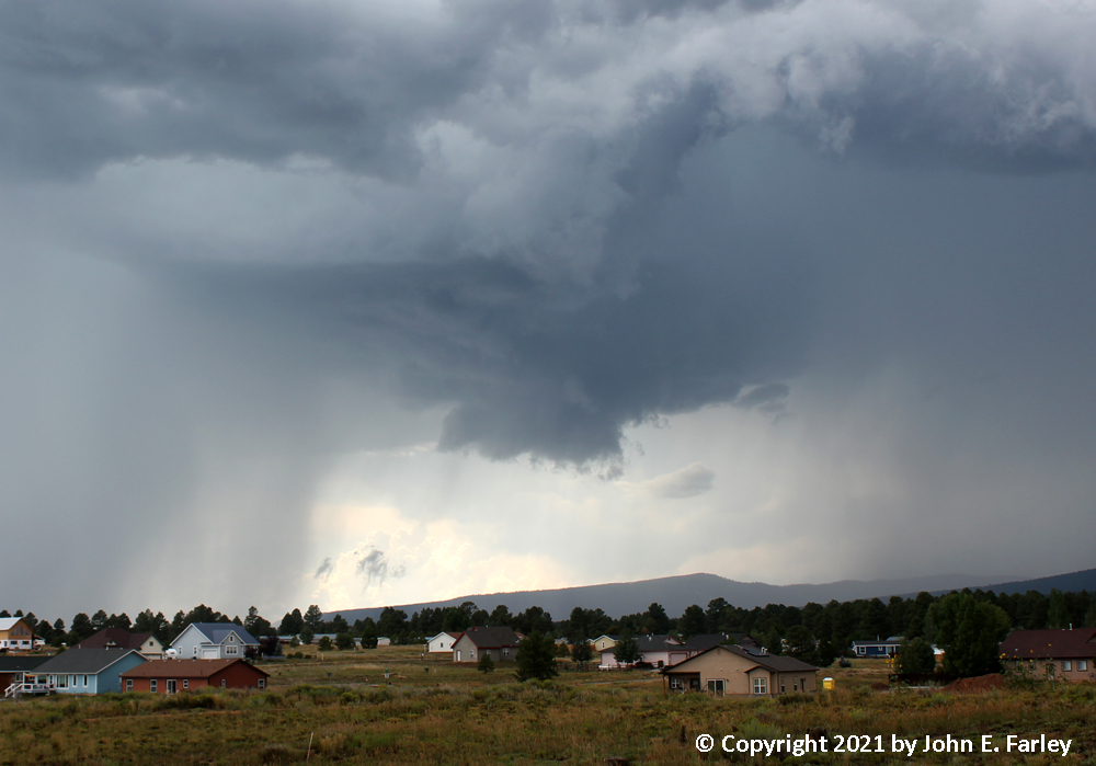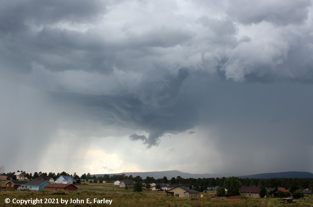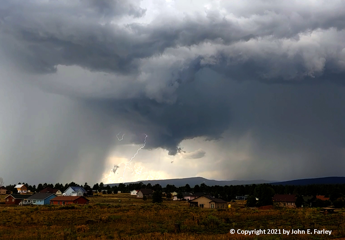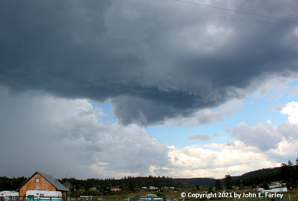 We don't get this kind of storm structure too often in southwest Colorado, particularly with lightning coming right out of a wall cloud. After this the storm continued on to the northwest, and I went home, where my wife reported a lightning strike had occurred very close to the house - at first she thought it had struck the house, but apparently it did not, or at least there was no damage if it did. She also reported a burst of heavy rain and small hail, as did others in the Pagosa Lakes area.