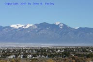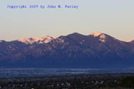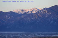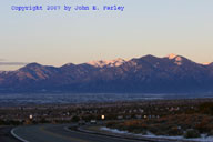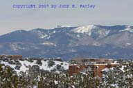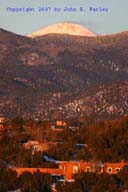 Farther south in the Sanger de Cristo Mountains, near Santa Fe, the alpenglow can also be quite impressive, as shown in the next two pictures. These pictures show Santa Fe Baldy at sunset, the first with a home illuminated by the setting sun in the foreground and the second taken when the sun had set in town and in the lower mountains, but while it still slightly illuminated Santa Fe Baldy.