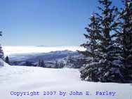 The next set of pictures are ones I took while skiing at Pajarito Ski Area near Los Alamos on December 31, the day after the storm.. The first is looking into the Valles Caldera, a valley that was created by the collapse of a huge volcano. The others are looking the Rio Grande valley. Both the Valles Caldera and the Rio Grande Valley were filled with remnant low clouds left over after the snowstorm, but at around 10,000 feet above sea level in the Jemez Mountains, I was well above the clouds when I took these pictures.