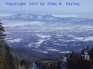 The next group of pictures, all taken from the summit of the Sandia Peak Ski Area on January 10, more than a week and a half after the big snowstorm, shows how white it still was around the Albuquerque area. The first picture, looking east, shows the southern section of the Ortiz Mountains and the high plains beyond. The road near the middle of the picture is the Turquoise Trail (NM route 14), the "back way" between Albuquerque and Santa Fe. The next shows the Sandia Peak Tram as it starts its journey down, and the third looks across the northern edge of Albuquerque, with Mt. Taylor in the distance.