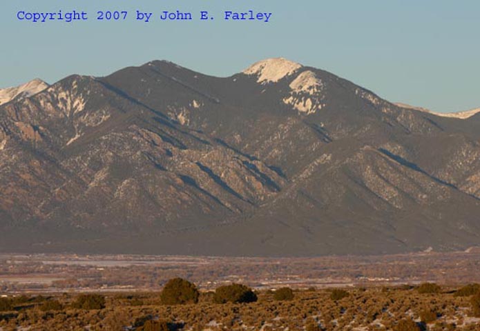 Speaking of the mountains around Taos, I was fortunate to pass through the Taos area around Sunset on January 4, enabling me to photograph the famous "Taos Glow." This is the alpenglow that occurs in the mountains near Taos when the light from the setting sun creates orange and pink tones in the mountains. The photos below are arranged in a sequence of decreasing sunlight intensity and increasing distance from the mountains (though with varying degrees of zoom using a 75-300 zoon lens), as I worked my way west looking back east at the mountains.