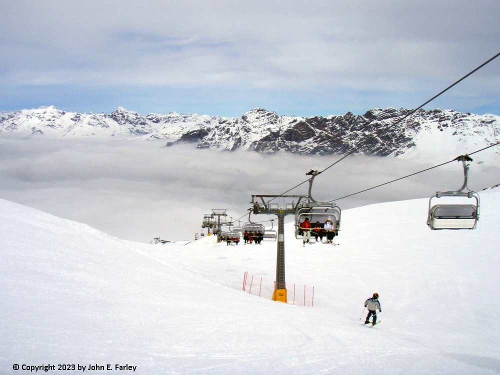 This was my first (and so far, only) time skiing the Alps. This picture captures a piece of what is special about it. Here, I was skiing above the clouds. But with the ski area's huge vertical drop of nearly 5,900 feet, you can go and go and go without having to get on a lift, through different weather and climate zones. On this day, after riding multiple lifts to get to the top, I skied above the clouds, through the clouds, and below the clouds.