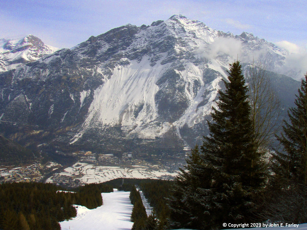 Bormio is a beautiful mountain resort town in the Alps. It is old, having its origins as a Roman town, and a main street is the Via Roma, originally a Roman road. Today, the main draws are skiing, scenery, and the hot springs located just outside town. This picture looks down on the town from the ski slopes of the Bormio ski resort.