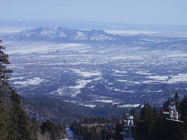 Because of the shape of the Sandia Mountains - abrupt cliffs on their west side facing Albuquerque and gradual slopes on the east side, where the ski area is located - the runs here tend to be rather similar to one another, though there area a good number of top-to-bottom runs to choose from. All the top-to-bottom runs are long, gently-sloping runs, most of them best-suited to easy-going intermediate skiers. These runs, and the two double chairlifts that serve them, are about a mile and a half long, covering a little better than 1,700 vertical feet. The top of the mountain, at over 10,000 feet, towers a mile above the city of Albuquerque, so it WILL be a good deal cooler here than what it is in town, and may also be cloudy or stormy when parts of the city are sunny and warm. Often, though, Sandia Peak skiers enjoy bright sun and New Mexico's deep blue sky. On such days, it is beautiful and - as you can see in the picture above - the view is great, but it is colder than in town.