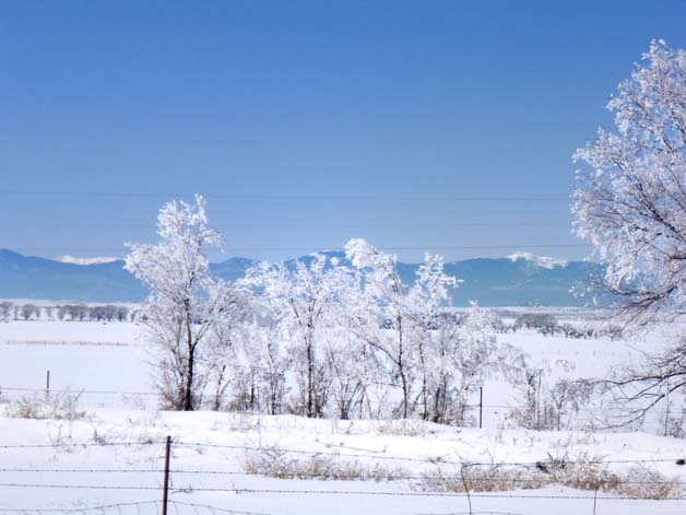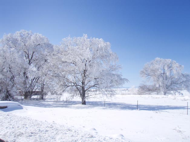While driving from Santa Fe, NM to the National Storm Chaser Convention in Denver on February 12, I encountered some rather spectacularly rimed trees a little north of Springer, NM along I-25. The rime formed on the trees due to fog with temperatures well below freezing, resulting in the supercooled droplets of the fog freezing onto the trees. Fortunately, the fog had cleared well before I passed through the area, but with temperatures in the teens and little wind, the rime remained on the trees and the deep blue sky provided for a spectacular backdrop. The low temperatures were undoubtedly helped along by the deep snow cover of about a foot and a half from a series of recent snowstorms in New Mexico's northeast highlands - the area around Springer had considerably more snow and lower temperatures than either farther south around Las Vegas and Santa Fe or farther north from Raton into Colorado. Here are a few of the pictures I took: