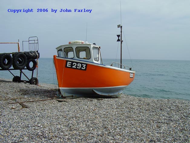 I photographed this fishing boat on a pebble beach in Devon, Endland in May, 2006.