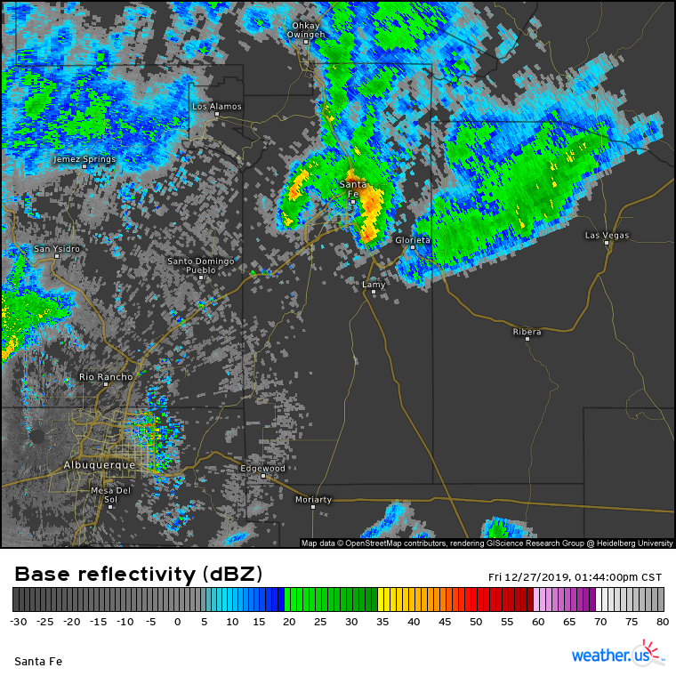 11:30 a.m. - I am thinking that if I can get to high enough an elevation for the p-type to be snow, I can get thundersnow. The temperature in Santa Fe is in the low 40s, but colder is air likely to be pulled down with precipitation, so in the areas getting precipitation, it is likely colder, in the 30s. The Santa Fe elevation of 7000 is borderline for rain or snow with this system, so I want to intercept the storms at a higher elevation. However, with the storms moving almost due north, it looks like they will pass west of the mountains. So after some indecision, I decide to intercept in the higher terrain (but not mountainous) north of Santa Fe along route 599.