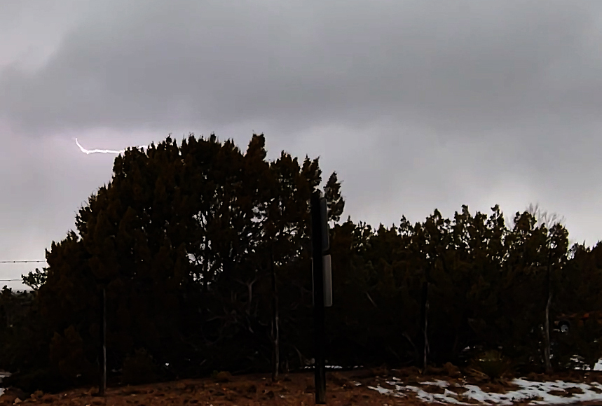 11:45 a.m. - I am just north of route 599 east of Caja del Rio and west of Camino La Tierra - I had to go farther west than I anticipated to reach the mainly northward-moving storms; hoping p-type will be mainly snow or graupel/snow pellets to get thundersnow video. From 11:45 to 12:05, I get video as two cells in the narrow N-S line of convection move through. Main p-type is graupel/snow pellets with some ordinary snow also at times, and a little rain mainly at the start. With the precipitation, the temperature quickly fell to around 37 or 38 and stayed there throughout the time of my observations. There is lots of lighting and thunder, and I am lucky enough to get two bolts on video. Some of the lightning, either overhead or with nearby strikes, is less than 1/4 mile away. The heaviest precipitation passes to my west, so I didn't get real heavy snow or graupel with lightning and thunder, but it did afford me a better view of the bolts which I probably would have missed had I been in the core. Here are a couple video stills of the bolts I saw, with light graupel/snow pellets falling at the time: