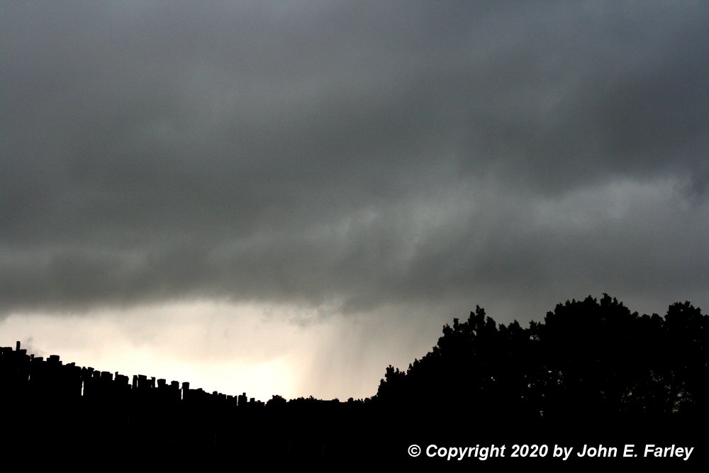 You can see in the radar loop that as the storm crosses route 599, there are two distinct cells in the line, something that was very evident to me as I observed the storms and which I discuss in the video linked below. Also, a very clear-cut updraft base was visible south of the southern cell of the two, with even a shelf-cloud feature along the leading edge near the edge of the precipitation core. Here is a picture of that feature: