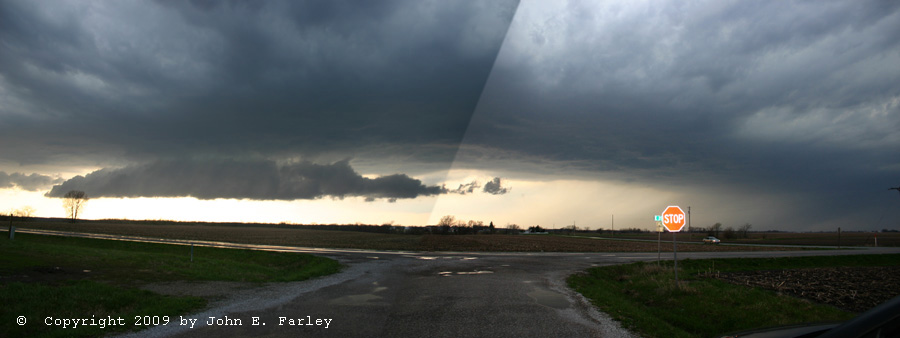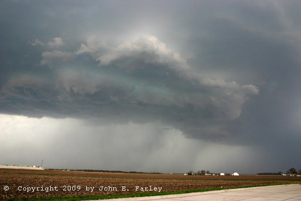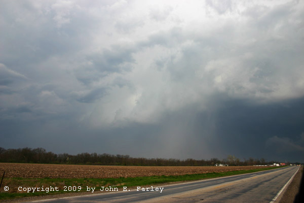 I took this picture just after driving through the south end of the line, where I encountered north or northwesterly outflow gusts of around 40 mph or a little stronger. However, when I took this picture, I was in the southeasterly inflow ahead of the line which I would estimate as gusting to around 35-40, a guess confirmed by a measured gust of 37 in Macomb ahead of the line. So, there was very strong convergence at the leading edge of the line. I stayed ahead of the line through Macomb, as heavy precip filled in behind the southern extent of the shelf cloud: