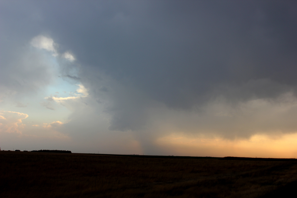 Around 6 p.m. or so, circling back south and west to intercept a new tail-end storm coming up from around the Syracuse, KS area, I get to Leoti - lots of water everywhere and some things blown around. On the way to there from route 83, I encounter intense, dusty inflow winds, blowing from the southeast into the cluster of storms north and NW of Leoti. For a brief time, visibility is near zero in blowing dust from the inflow. I toy with going after the still-intense but messy clusdter of storms north and NW of Leoti, but decide instead to go after the Syacuse storm, now SVR warned for 2-inch hail with a "tornado possible" tag on the warning. As I do this, I notice a new storm going up to the east near Scott City. I think about going after it, and in hindsight, I should have. But with the warning on the storm to the SW, I go after it. But it looks unimpressive after a while, so I turn back north, then east. Then of course it gets a new warning with report of more 2-inch hail. I stop east of Leoti to take pictures, clearly it is LP and high-based, so tornado unlikely. Nonetheless, it produces 2-inch hail around 6:30 10 miles N of Syracuse, around the time I get this picture looking to my southwest:
