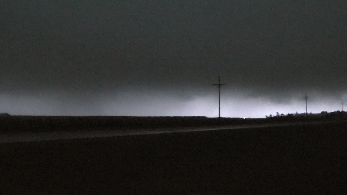 The storm really ramped up just north of Gove, producing golfball to 2-inch hail in Grainfield and a tight couplet for a while. But by the time it got to Grainfield, it was north of the front over the cold air at the surface, so less likely to produce a tornado. Later, after dark and after I left it, it even got a TOR warning well NNE of Grainfield, but I saw no reports of any tornadoes. By the time the storm was dropping hail on Grainfield, it was hard to see anything with this storm between it getting dark (now around 8:30 central) and the very low clouds that were everywhere on the cold side of the front. This kind of captures what it looked like: