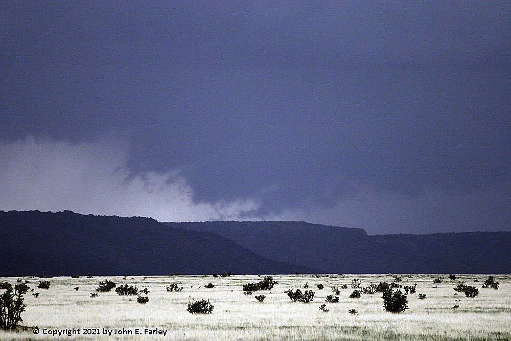 I continued through Branson and up the mesa into NM. About 3 miles in, I came to a place with open fields and a fairly clear view of the now very-impressive meso. The bottom was blocked by the highest part of the mesa, but considering that I was in wooded, mountainous terrain, this spot had an amazingly good view, and still an internet connection, too. The meso tightened up and extended to somewhere lower than I could see over the mesa - for a short time I thought it had something of the look of a tornado, but that did not last long, and in any case I could not see the lowest part of it due to the mesa - but what I could see looked impressive:
