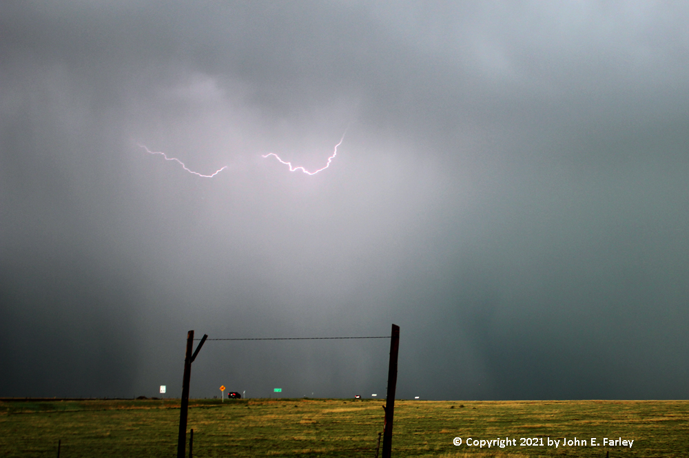 Naturally, after I turned west, a TOR warning - the first of the day, was issued - not for the bow-head area to my west, but rather for a location along the bowing line of storms northeast of La Junta. Quickly checking RadarScope on my phone, I could see that there was indeed a strong area of rotation in that area - but all I could see looking toward that part of the storm was intense precipitation, including what appeared to be some hail shafts. I headed ENE from Ordway on 96 to try to catch up with the storm, but it was not going to happen before dark. So I stopped to get some shots of the very frequent but mostly in-cloud lightning before heading south to La Junta to find a room for the night and dinner.