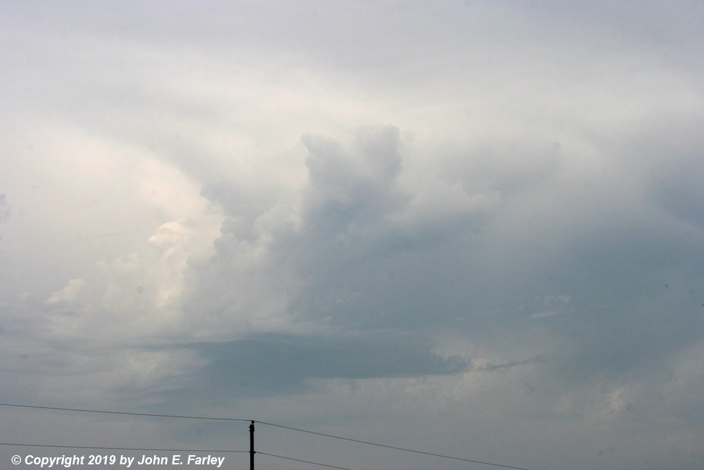 At this point the storm was supercellular and soon went SVR-warned, mainly for large hail. It had a lot of rising scud and occasional lowerings, but did not appear that tornado was imminent at this time. However around 4:40 p.m. it did produce what appeared to be a brief, tiny funnel. But it dissipated quickly and went nowhere near the ground.