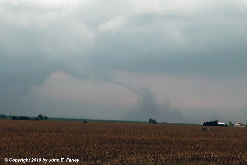 During the ropeout stage the condensation funnel became very narrow and horizontally stretched out, but the dust swirl actually became bigger. It was likely at some point during its ropeout that the tornado caused the most serious damage, hitting a farm and destroying a number of structures and severely damaging the farmhouse. Fortunately the couple who lived in the house knew well where the safest place in the house was, and went to the one room that remained fully intact, thus avoiding injury. Here are a couple video captures of the tornado in the ropeout stage: