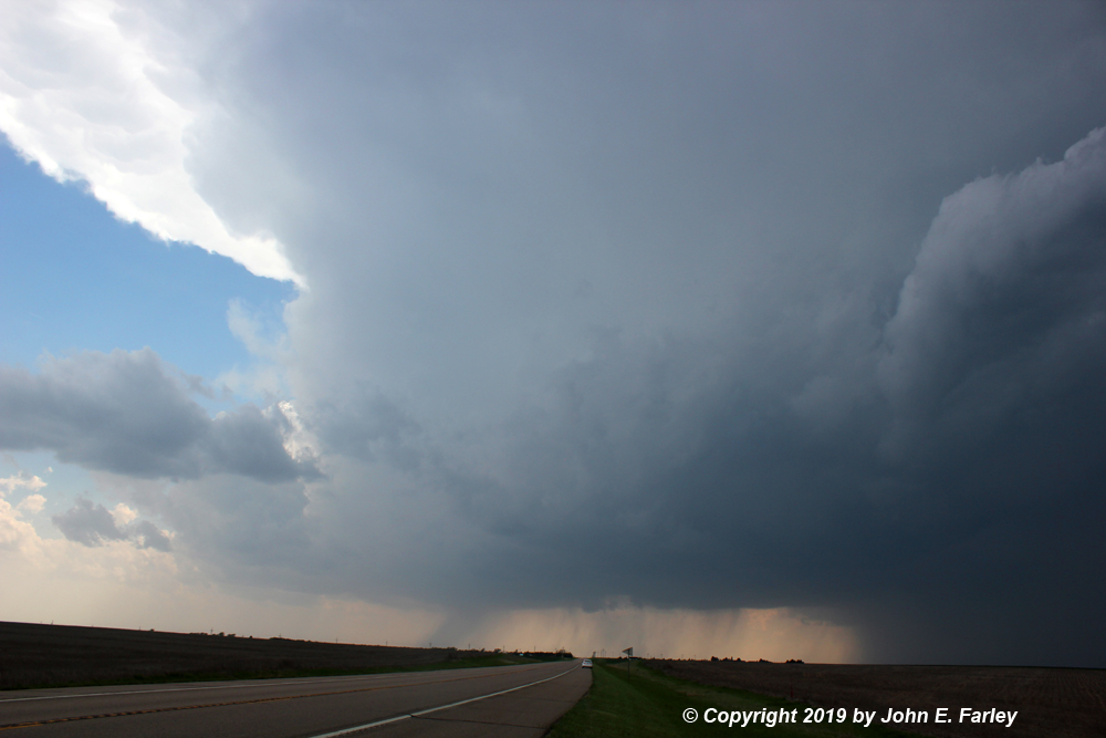 I watched the storm for quite some time from this position (in hindsight, probably a little too long). Eventually I knew I needed to stairstep east and north to re-intercept it. Going north form Atwood was not an option because the storm was about to cross that road with its large hail. So I went back to Oberlin and then back north toward Culbertson on route 17.