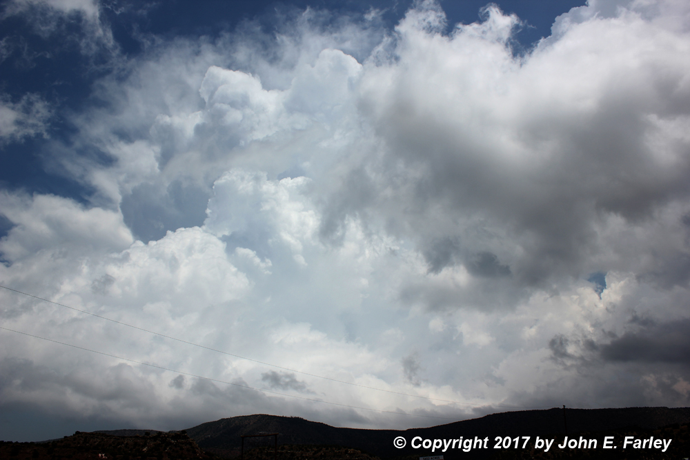 After a quick gas and lunch stop in Santa Rosa, I gradually began to see the storms that I had been watching on radar northeast of Tucumcari. The tail-end storm of the cluster was south or SSW of Logan, and I decided to head north from San Jon to intercept that storm. Around this time I heard that SPC had indeed issued a severe thunderstorm watch for eastern NM and the western TX Panhandle. So that makes 3 for 3 this week on watch issuances after saying there was only a 20 percent chance of a watch. By the time I got into the area of the storm it was around 3:15, and the storm was not too impressive at first. But a new updraft went up on the southwest end of the cluster of storms, and rapidly intensified, as I sat a few miles to its SE on 469. There was continuous thunder, all seemingly from in-cloud lightning, as I saw no CG. I let it cross ahead of me, and got a nice picture of it around 3:30 just to my NE, as it continued to intensify.