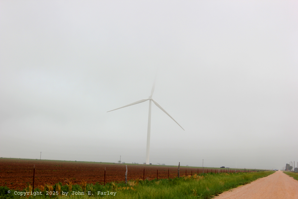 Came through the large wind farm near Grady NM. Eerie look with the low clouds and fog covering the upper parts of the wind turbines, but the lower part more visible. Kept on task at first and thus missed the best images of these, but eventually had to stop and take a few pics.