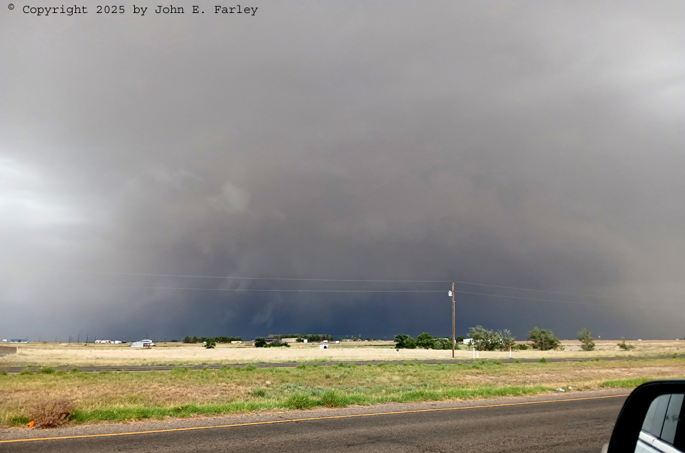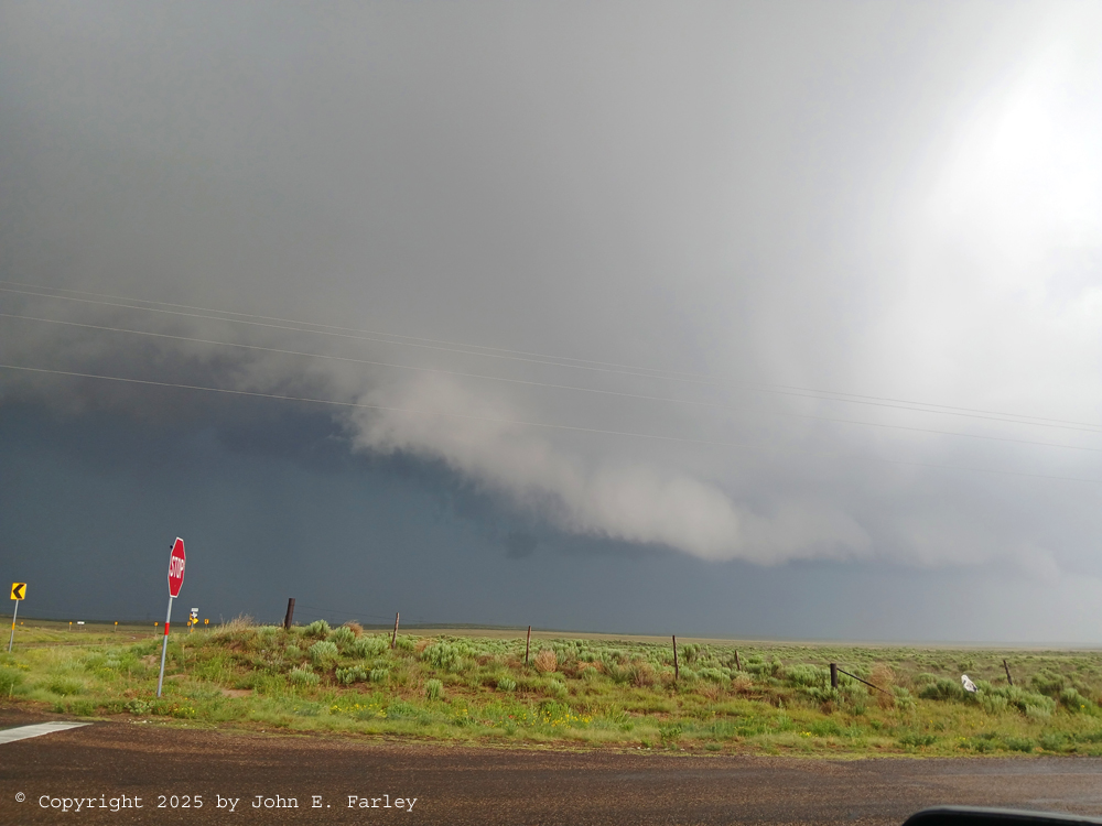 I was still in the path of this storm, and becoming concerned that I would get crunched because this storm was showing signs of merging into the storm to its south-southeast, which was intensifying and was also now tornado-warned. Indeed after that warning it did produce its first of many tornadoes near Lingo, NM. But more on that storm later. I decided to move again to escape the incoming hail, but after that the storm I had been watching came under the influence of the other storm to the south and rapidly weakened. They nearly merged, but then northern storm had a last gasp and surged north a bit, perhaps briefly evolving into a left split. Anyway, it was right on my route to get to the now-dominant southern storm, so I had to back away and let it pass before I could do that. New warnings mentioned the possibility of 4-inch hail, which was probably in the southern storm, but left splits can produce big hail too, and the storms had come so close to merging, I was afraid that if I drove into even the left split they might be indistinguishable and I might drive into giant hail. So I waited a bit and as I did, the storm offered one final bit of eye candy with a nice shelf cloud: