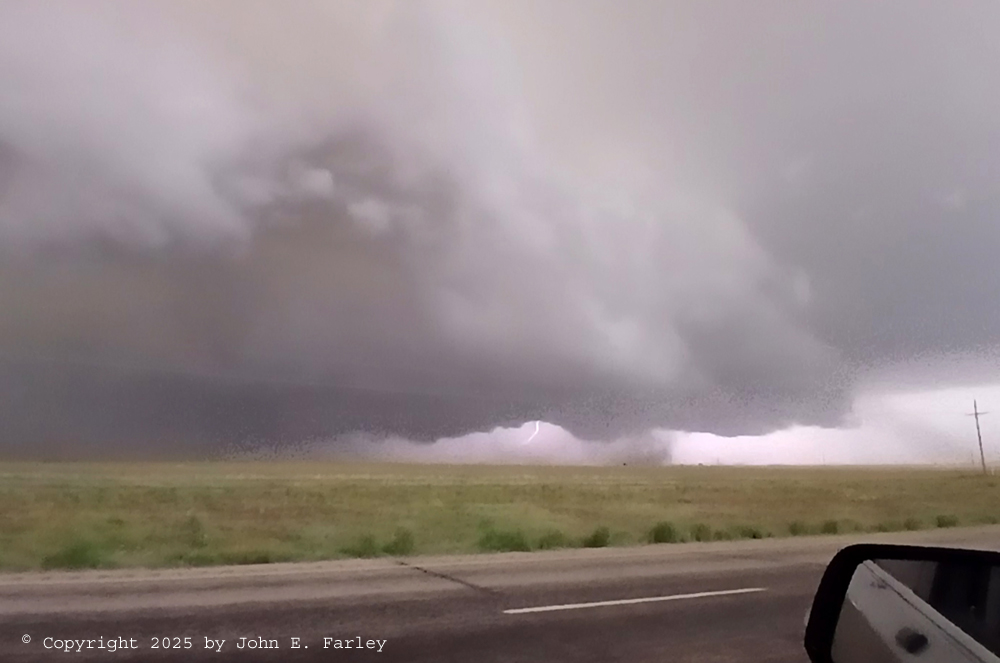 But it soon became evident that it was now making a hard right turn and that I was in the path. So to stay out of the hail, I went to the south edge of Portales and took a paved road that went mostly east with occasional southward stair steps. Thought this would get me far enough S to be S of the storm's path, but the storm kept turning right until it was moving to the ESE, a good 90 degree turn from its initial movement. But honestly I should have paid more attention to my initial thinking in the morning rather than the storm's initial movement, as indications were the storms would move east or SE. Anyway, stopped a couple times, got video, and realized I was still in the path. Eventually stopped at the NE corner of Salt Lake, at the NM-TX state line. I knew I was still in the storm's path, but had a little more breathing room and a good view of the wall cloud. After a few minutes, my phone alarmed for a TOR warning, and it was for my storm, not the next one S of it, which was also SVR warned by now. The TOR warning was issued at 3:36 p.m. for rotation 11 miles SE of Portales, which would place it around that distance to my SW. Actually, turns out the first tornado had already happened by then, a brief weak one near that location which I had my video camera pointed at but did not see. An NWS employee who was closer to it than me and reported it indicated to me that it was a bowl funnel with rotating tendrils, and I do have something that kind of fits that description in my video around that time, specifically some rapidly moving cloud tags that seem to be moving in opposite directions. Can't see the bowl funnel very well but there does appear to be a low-contrast, broad lowering north of the main wall cloud and above the cloud tags, so that could be it. So I will say "maybe" on getting this one. Here is a video capture from around that time. The cloud tags/tendrils, which are just to the right of the wall cloud in the picture, were moving quite noticeably and some in opposite directions, so if I did capture that tornado, I think this is most likely it: