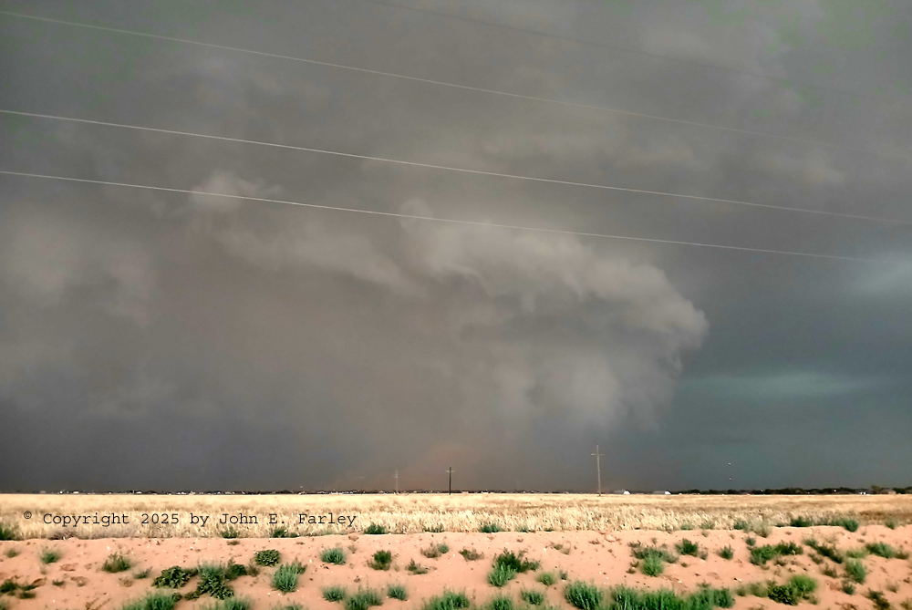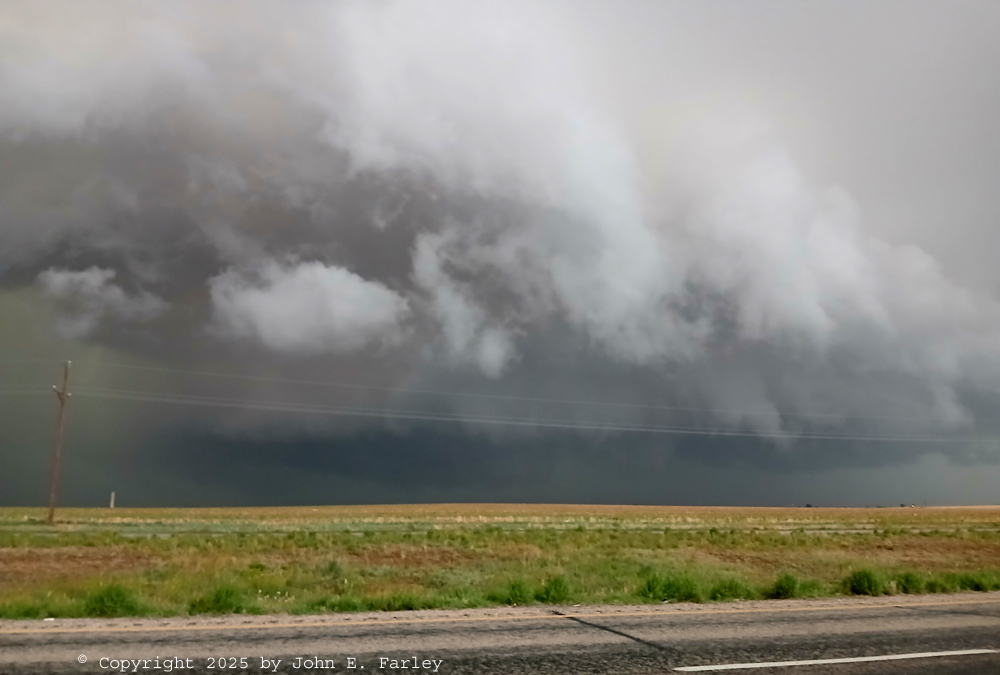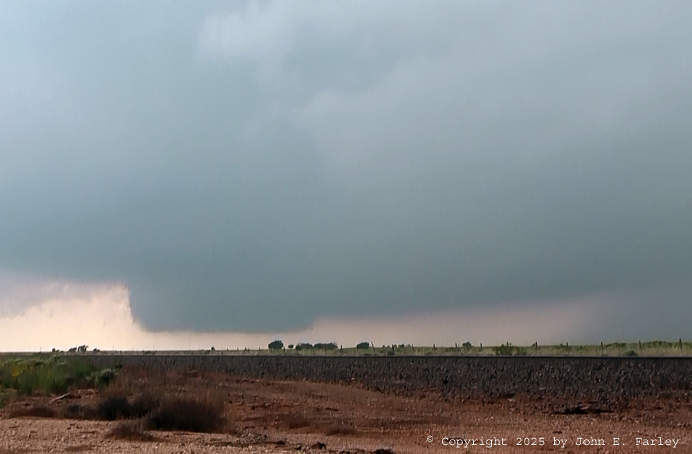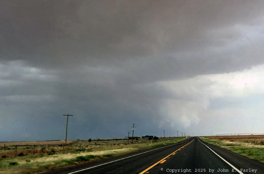 Continued south through Clovis to a little NE of Portales. By now, around 2, storms had initiated well SW of Portales. Initial movement was to the NNE but I expected them to make a right turn, so I cut east a few miles NE of Portales and sat and waited. Eventually one storm strengthened, and movement looked like it would take it NW of Portales, so I decided to move SW for an intercept. Soon there was another storm to its SSE, but the northern one looked better and was closer, so I went for it. Got to it around 2:30 MDT a few miles SW of Portales. It displayed an impressive wall cloud, and went SVR warned at 2:47 MDT for 1.5" hail and 60 mph wind.