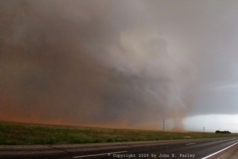 After I got the pictures above, a rear-flank downdraft (RFD) surge, or possibly the outer tornadic circulation, caught up with me around 7:26. Along the leading edge of this surge, at the right of this picture, there was also a gustnado: