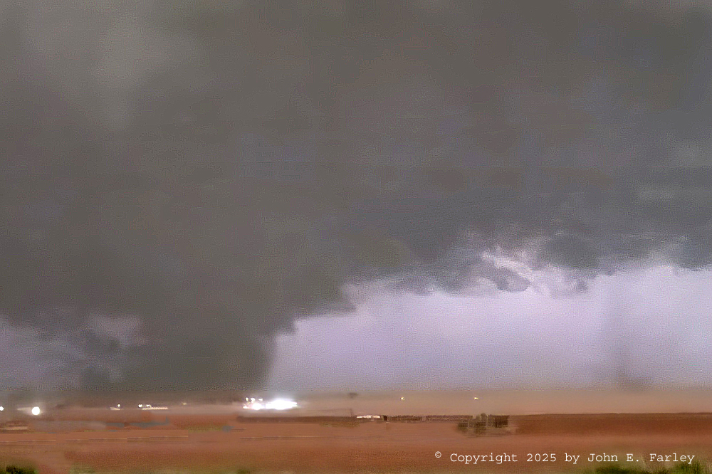 In both of these pictures, there appear to be vortices to the right of the lightning and possibly to its left back in the rain. And quite possibly others as well. Whether at this point in time it was multiple tornadoes or a very large multi-vortex tornado probably comes down to a matter of judgement. According to the NWS damage survey, the tornado may have been multi-vortex or there may have been at least one satellite tornado, which they suggest per spotter reports may have had a path north of the main tornado. In my pictures above, the feature lofting dust to the right of the lightning could, I suppose, have been an intense burst of straight line wind, but even that, given its motion around the large meso, could arguably been part of a large tornadic circulation. But I think it more likely was a vortex, maybe either a satellite tornado or a subvortex of the main tornado. If you look at its position in the two pictures, which were taken looking northeast, it is farther away in the second picture but relative to the clumps of grass by the road, in the same position or slightly more to the left. This strongly suggests it was rotating around the larger mesocyclone, so possibly either a subvortex or a satellite tornado. Or, comparing to the track in the damage survey, possibly the main tornado. Yet another possibility, given the times in the damage survey of this tornado and the next one, is that the main tornado is the lowering back in the rain and the one to the right of the lightning is the start of the next tornado, the larger one pictured below. Hard to tell, because the details were only visible when there was lightning. That said, the next tornado moved southeast and this feature was likely moving northeast, so I would guess that is the least likely scenario. But any way you cut it, what the NWS damage survey calls the first Smyer tornado is one of the features in these pictures. The damage survey says the tornado began at 7:12 and ended at 7:24. It hit a mobile home community and heavily damaged two of them, causing 2 injuries. The tornado was rated EF-1 with peak wind of 110 mph. It was estimated to have a path width of about a half mile and traveled 3.72 miles.