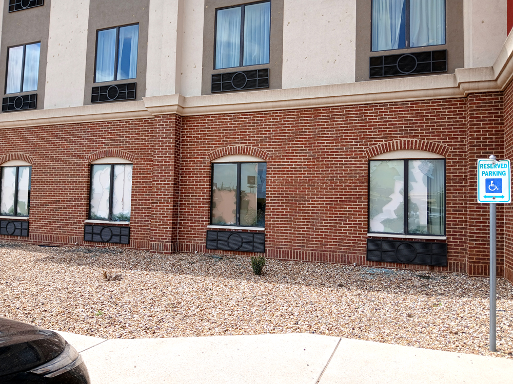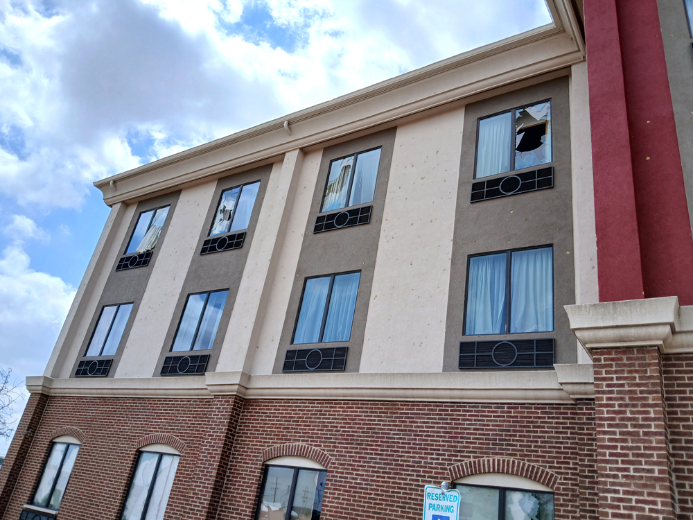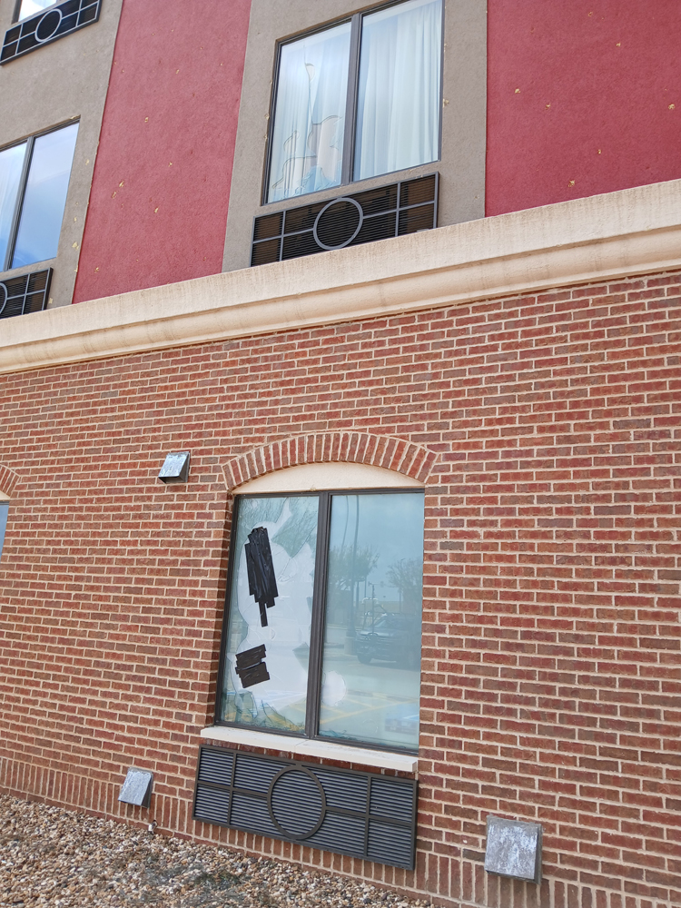 I thought I could cut southwest on US 62 from Wolforth, get southwest of the storm, and come back and find a place to stay after it passed. But it quickly became evident that was not going to work, as low clouds and precipitation were surging leftward (southeastward) toward the road ahead of me. Not going to work when the storm was warned for large, wind-driven hail. So I doubled back to a gas station canopy I had noticed and got under there as the high wind, rain, and hail blasted through between about 8:05 and 8:20 p.m. The canopy did not totally keep my car out of the hail, but it helped. Not sure how big the hail was there but would guess around an inch and a half, and the rain was so heavy that visibility dropped to 100 or 200 feet. After the storm, I encountered lots of leaves stripped from trees, flash flooding everywhere, and power outages with people trying to get through non-working stop lights on flooded roads. A real mess, but I was quickly able to find a hotel near where I was, albeit with many of its north-facing windows busted out by the wind-driven hail. Here are some pictures I took the next morning of the hail-damaged windows: