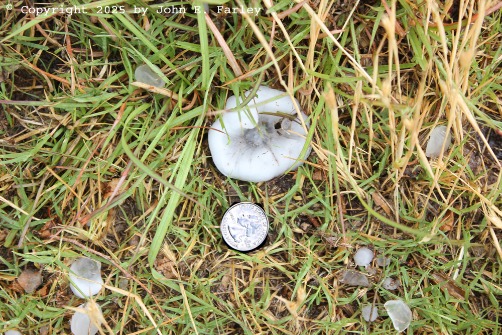 Once I knew that the northern storm was dying and the southern one was now the dominant storm and likely to stay that way, my mission was to try to catch up with it without getting caught in giant hail. Normally when you are behind a storm that is not easy, but in this case the movement of the storm was only around 10 to 15 mph to the east-southeast, and I had a pretty good road network including some roads that ran NW-SE, so I thought it might be possible, and it turned out it was. I heard about a large tornado north of Morton, which turned out to be probably the most spectacular tornado of the day, and unfortunately I missed that one. I was not terribly far from it, but being on the back side of the storm there was way too much rain to have any good chance to see it. But I kept trying to catch up, and eventually it worked. In the meantime, as I crossed the storm's path behind it heading southward, I encountered a lot of leaves stripped off trees, and then some big hailstones in Maple, TX. I stopped briefly and photographed a couple 2.5-inch hailstones: